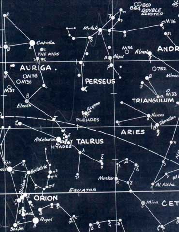 PLEIADES. ALL THE WAY TO THE UPPER RIGHT LOCATE THE DOUBLE CLUSTER IN